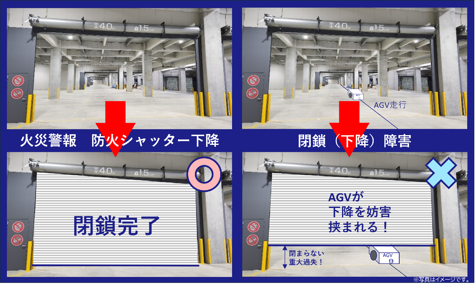自動走行で荷物を運ぶ搬送ロボットは、広い建屋内の防火シャッターを幾つも通過します。通過するときに防火シャッターが下降し始めるタイミングによっては、搬送ロボットの障害物センサーで検知できず、シャッターに挟まれることが考えられます。また、ロボットが挟まれなかったとしても、その後ろの搬送荷物がシャッターに挟まれることも考えられます。この状態が閉鎖障害となり、防火シャッターの機能を阻害する行為となります。
