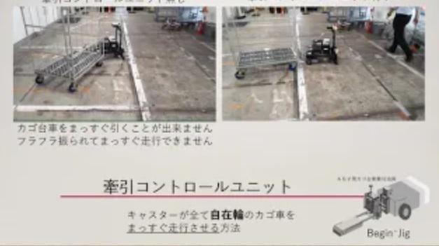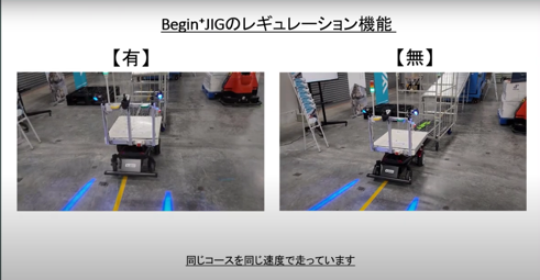 キャスターが全自在輪のカゴ台車をAGVと繋いで牽引するとフラフラふらつき、まっすぐ進むことができません。Begin+JIGのレギュレーションユニットを使用することで全自在輪でもまっすぐAGVの軌跡同様に牽引することが可能です。この映像では牽引レギュレーションユニットの無い場合と有る場合を比較してご覧いただけます