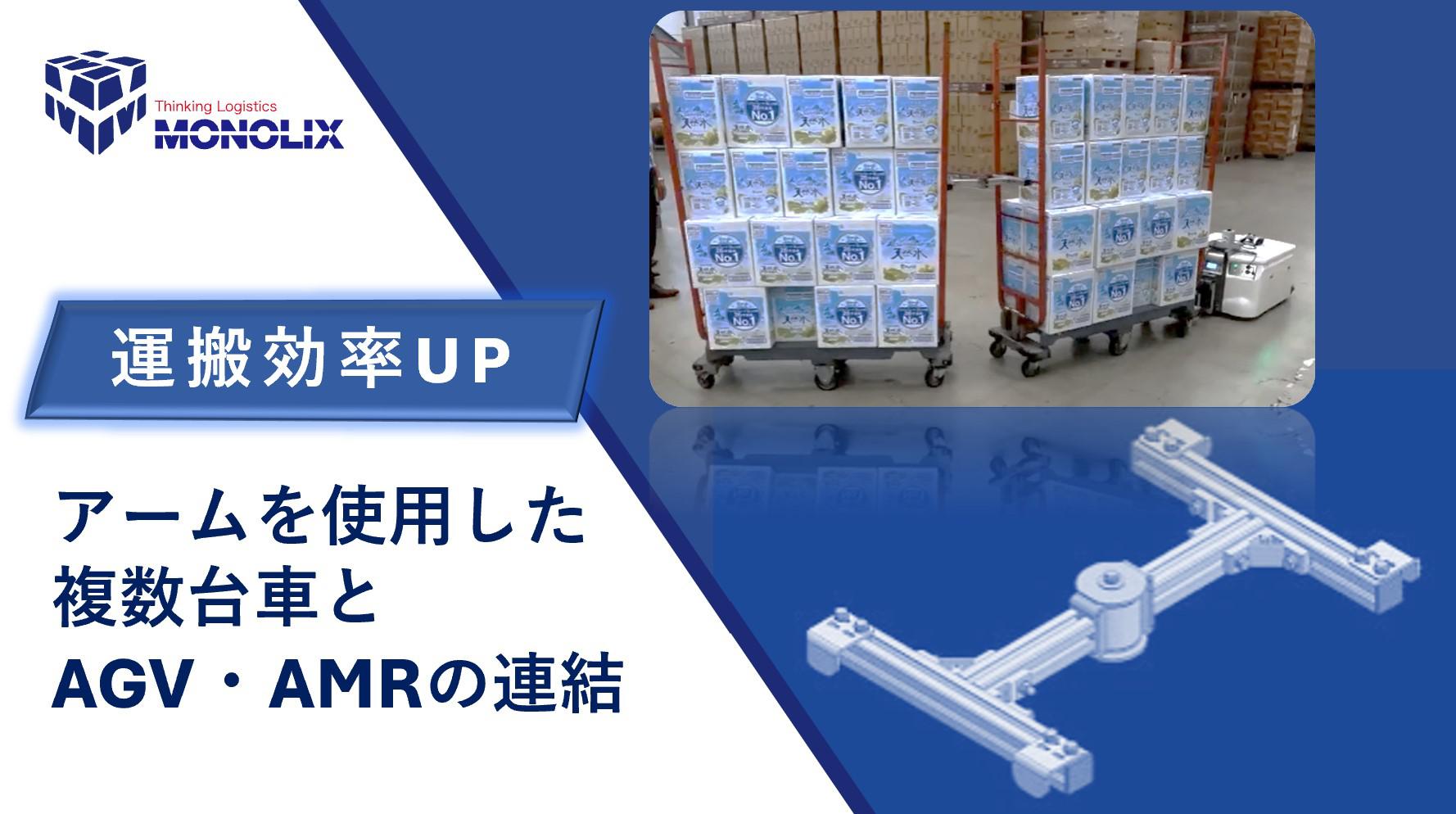 AGV/AMRでカゴ台車や6輪カートを搬送するときに連結アームを使うともう一台牽引することが可能です。 これまで1台搬送していた台車を簡単に2台牽引搬送できる様子を、実績映像でご紹介します(連結アームの動画をもっとみる)