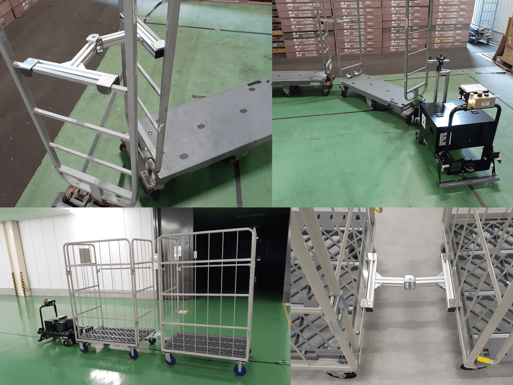 AGV専用パレット台車・AGV搬送に必要なノウハウ・保管時の省スペース・自動切離し【ラインナップ】Z型・全自在輪仕様・ネスティングO型・2輪固定輪・列車連結1100×1100 500kg積載