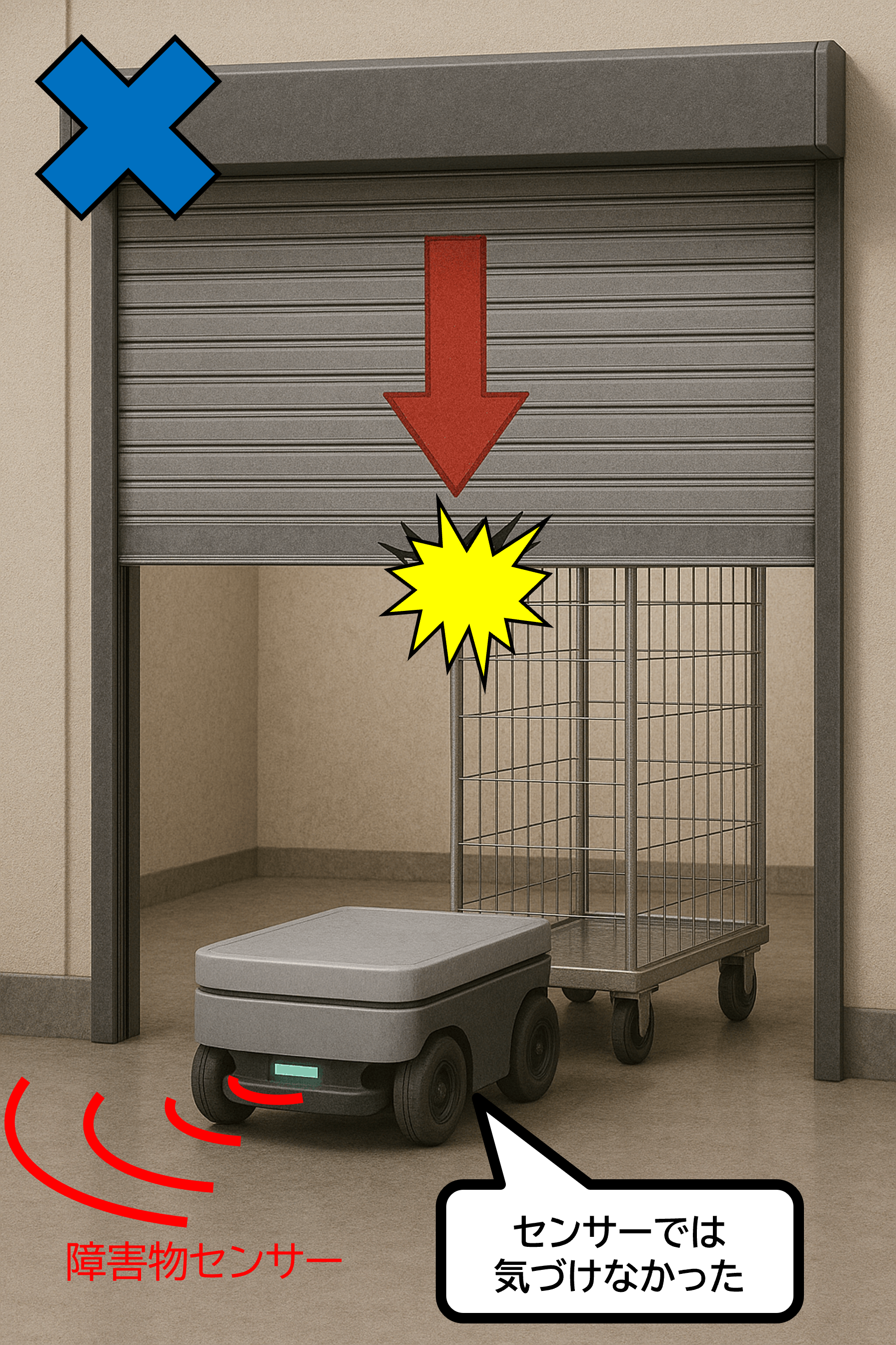 もし、火災が発生し防火シャッターが下降し始めたときにAGVが防火シャッター下付近を走行していたとします。障害物センサーがシャッターを検知できれば手前でAGVは停止することができ防火シャッターは床まで正常に下降します。しかし、障害物センサーが下降中のシャッターを検知できず通過し続けた場合、シャッターにAGVが挟まれたり、AGV後部の荷物がシャッターに引っ掛かり、シャッターが下降できず閉鎖障害となります。